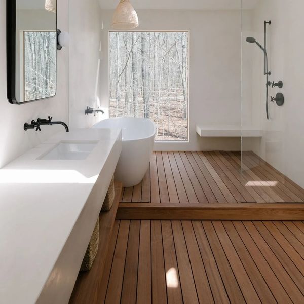 - Avec une grande ouverture sur l'extérieur, la salle de bains devient une invitation au rêve. Petite astuce visuelle : le plancher tout en teck efface la délimitation de la douche. Un espace agréable à vivre avec la sensation d'être dehors.