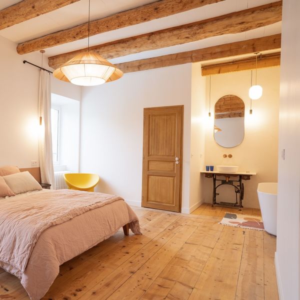 - Dans cette chambre d'hôtes, ouvrir la salle de bains sur le coin nuit est une évidence. Cela permet un confort idéal pour les voyageurs et apporte un bien-être. Grâce à de beaux volumes, la chambre abrite la salle de bains dans un angle avec une baignoire et un point d'eau. Le tout à mi-chemin entre authenticité et modernité.